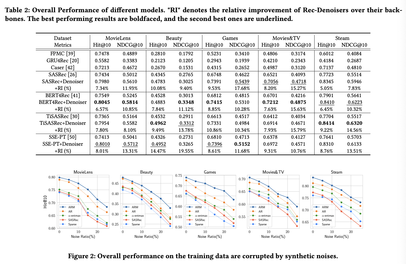 - 다만, Rec-denoisers가 다른 모델에 비해 지속적으로 높은 성능을 보임을 알 수 있다.