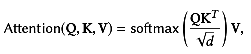 이때 $\mathbf{Q}, \mathbf{K}, \mathbf{V}$는 projection 행렬을 통해 나온 query, key, value matrix이다.