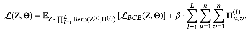 - $\mathbf{Z}^{(l)_{u,v}} \sim Ber(\prod^{(l)}_{u,v})$, 즉 베르누이 분포에서 뽑힌다고 가정한다.