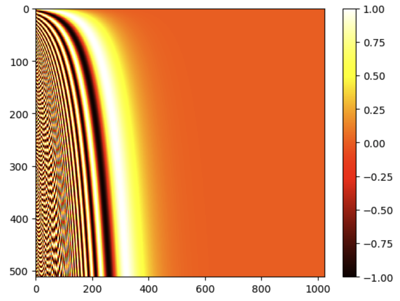max_length=512, embed_size=1024인 경우에 positional encoding에 대한 heatmap을 예시로 살펴보자. 구체적인 코드는 바로 다음에 살펴본다.