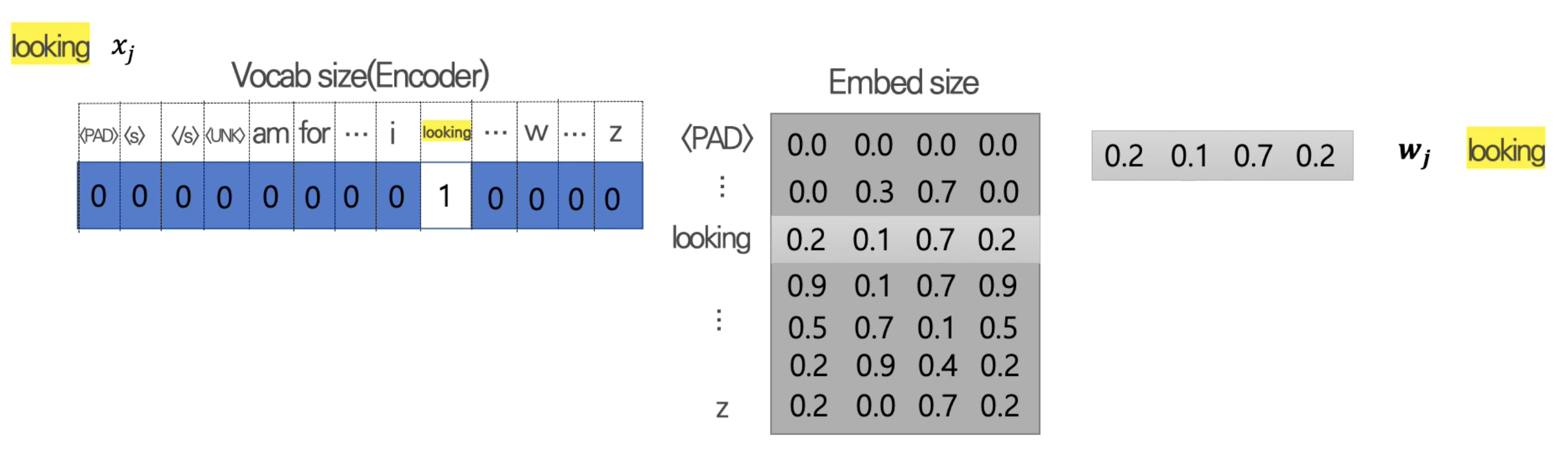 예를 들어, looking이라는 단어에 대한 임베딩 벡터를 찾고자 하면 vocab_size X embed_size 만큼의 임베딩 행렬에서 looking에 맞는 임베딩 벡터를 가져오는 것이다.