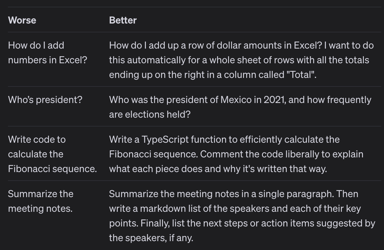 여러 상황에서 프롬프트 최적화를 할 수 있다. openai의 프롬프트 엔지니어링 팁을 보면, 프롬프트 엔지니어링된 예시를 아래와 같이 볼 수 있다.