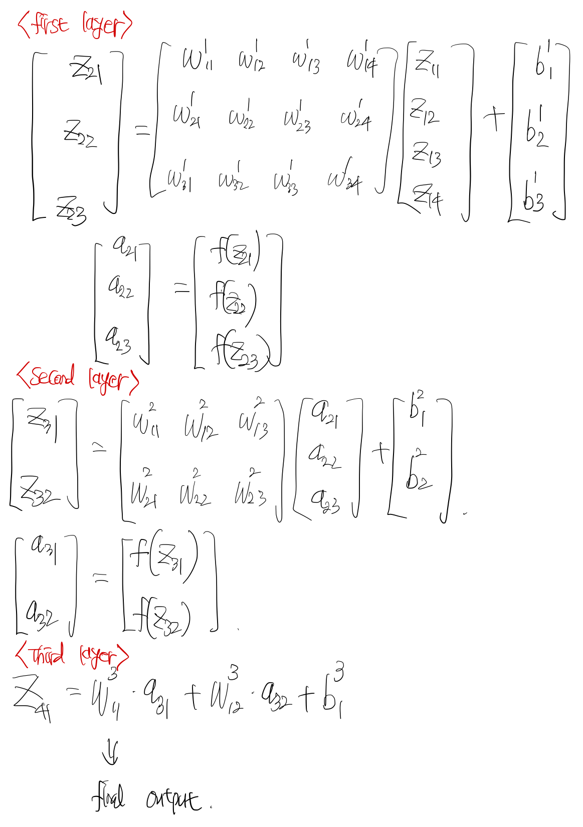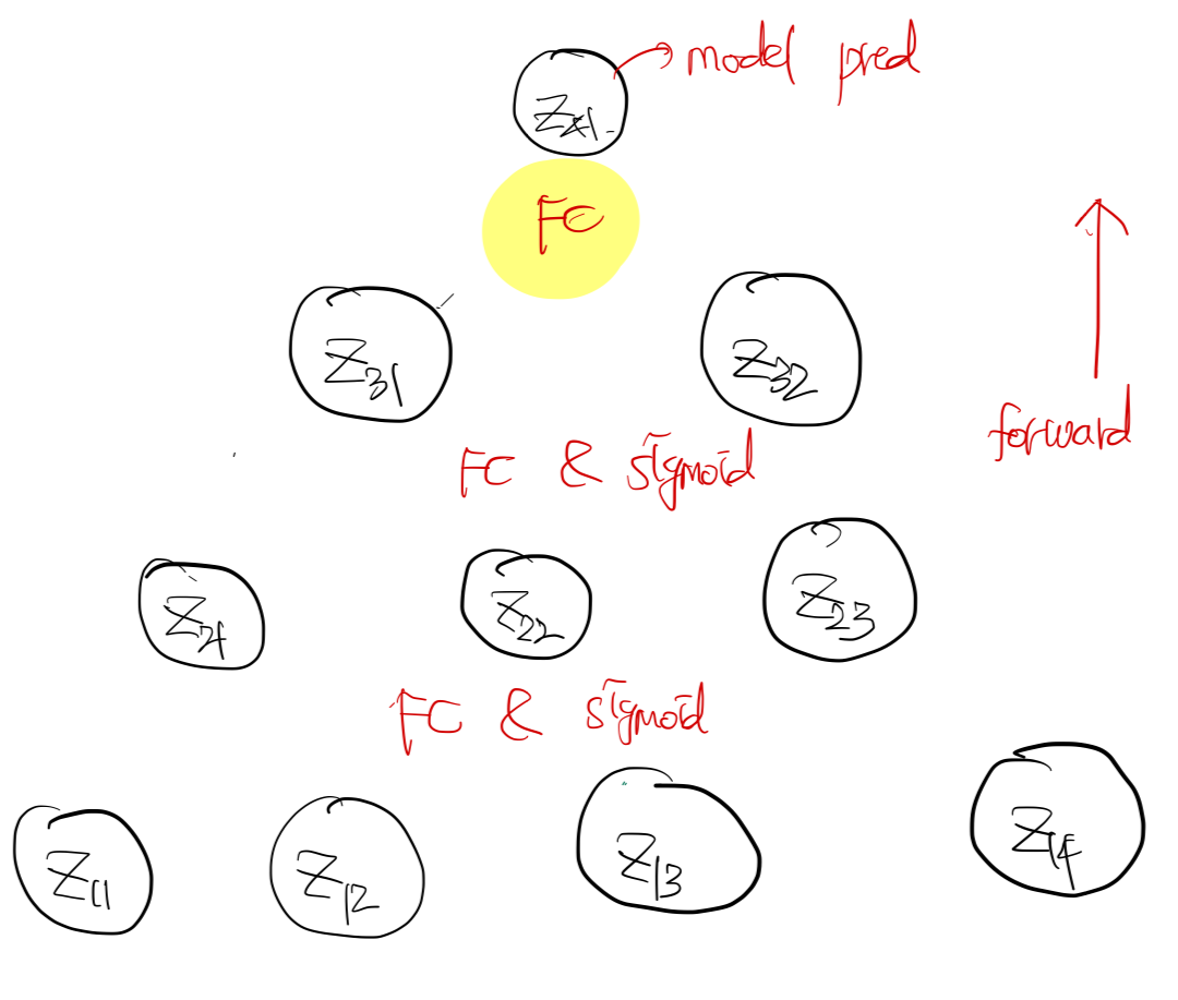 activation을 넣기 전, 후의 notation은 $z_{ii}, a_{ii}$로 정의한다. 첫번째, 두번째 레이어에서는 Fully connected layer + sigmoid activation function을, 세번째 레이어에서는 FC layer만 적용한다.