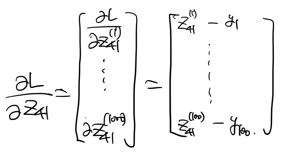 \[ L = \dfrac{1}{2} \sum^n_{i=1} ( y_i - \hat{y}_i )^2 = \dfrac{1}{2} \sum^n_{i=1} ( y_i - z^{(i)}_{41} )^2 \]