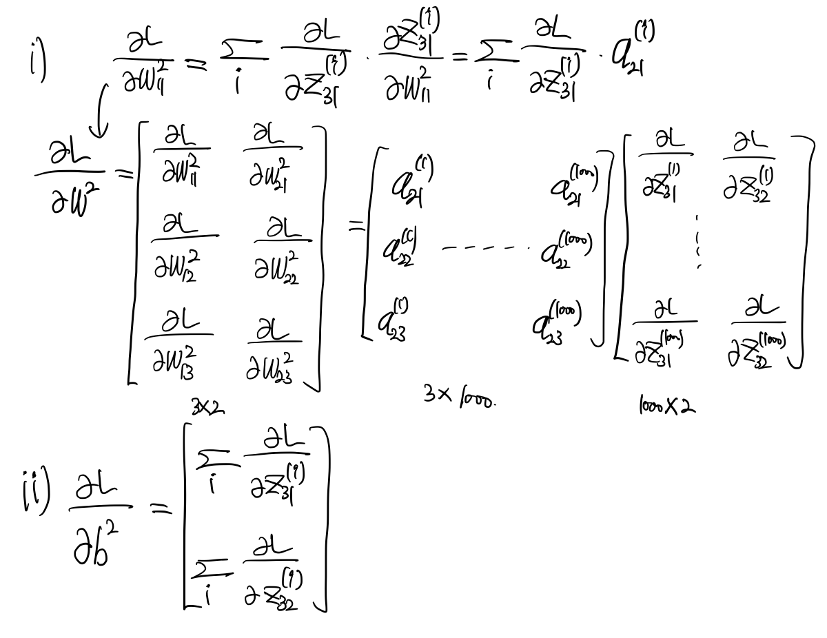 이전 단계에서 $\dfrac{\partial L}{\partial z^{(i)}_{31} }, \dfrac{\partial L}{\partial z^{(i)}_{32} }$을 구했다. 이를 사용하여 $\dfrac{\partial L}{\partial W^2}, \dfrac{\partial L}{\partial b^2}$을 구하면 아래와 같다.