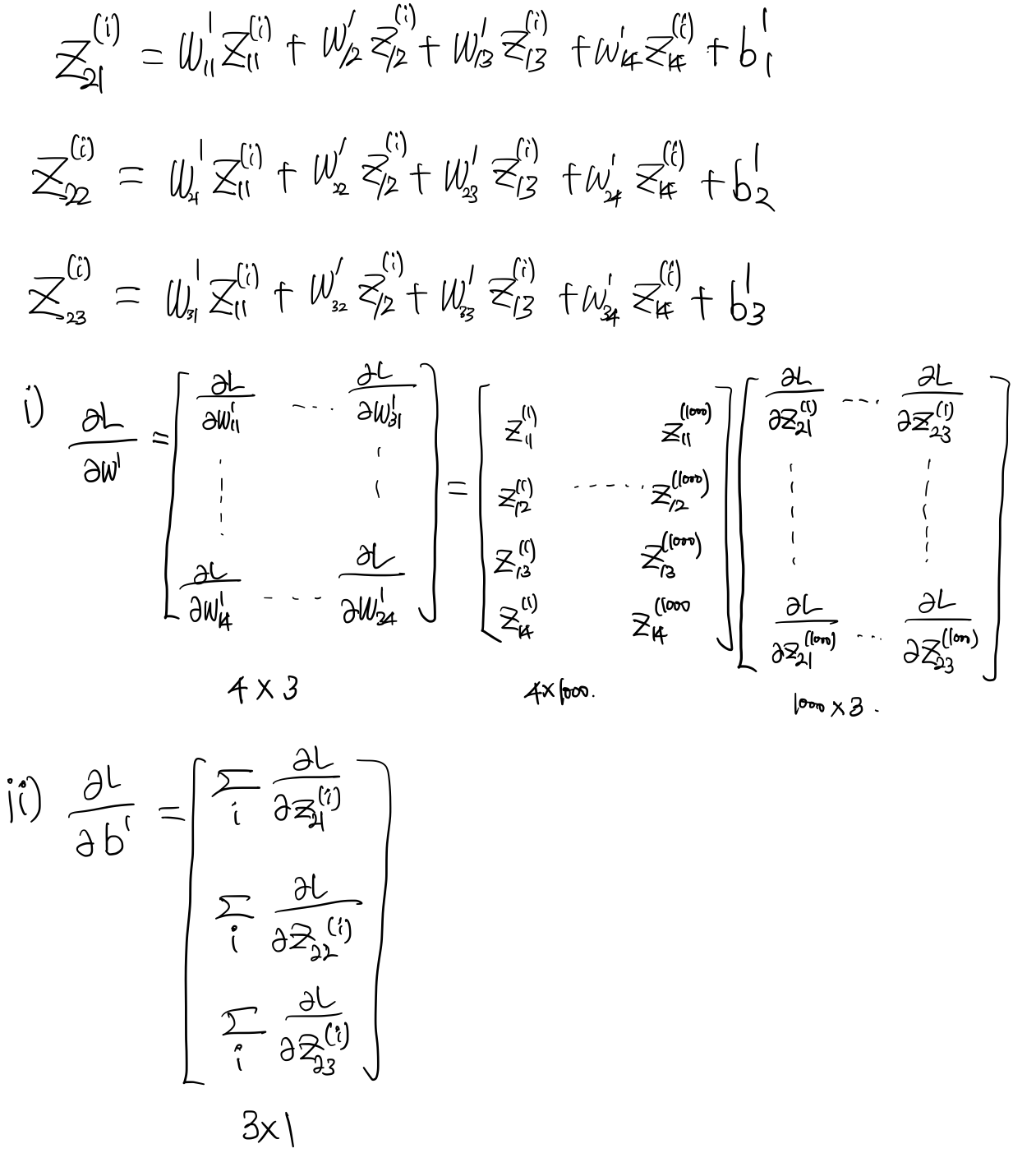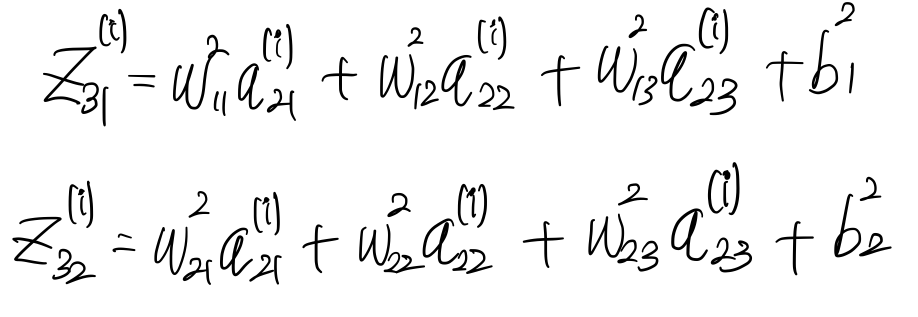 \[ z^{(i)}_{41} = w^3_{11} a^{(i)}_{31} + w^3_{12} a^{(i)}_{31} + b^3_1 \]
