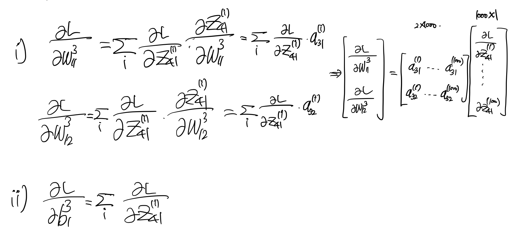 $w, b$의 윗첨자는 세번째 레이어임을, $z,a$의 윗첨자는 $i$번째 데이터임을 의미한다. 잘 생각해보면, 세번째 레이어의 weight는 2개, bias는 1개이므로 각각 $(2 \times 1), (1 \times 1)$ 차원의 벡터가 나와야함을 유추해볼 수 있다. 이를 바탕으로 gradient을 구해보면 아래와 같다.