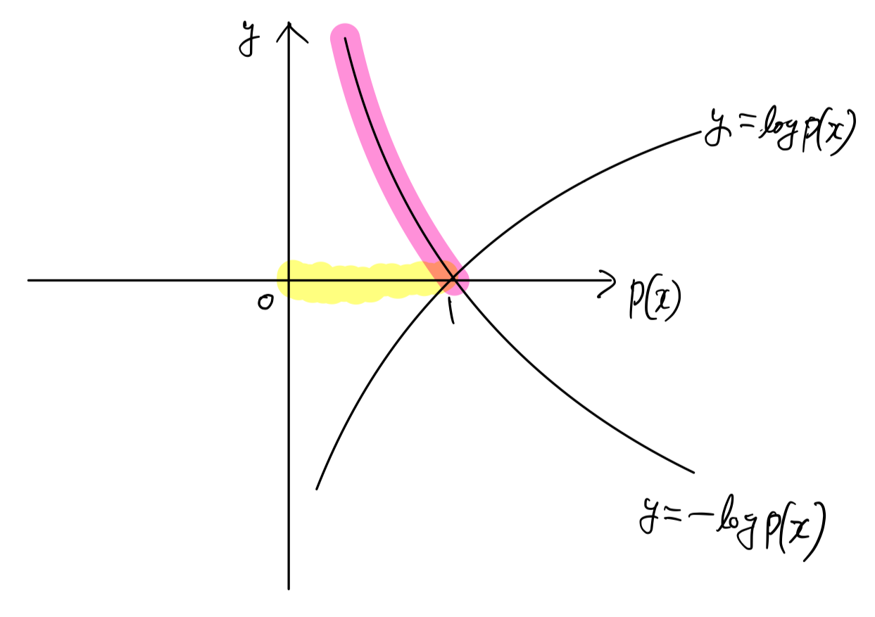 우선, 정의상 $0 \leq p(x) \leq 1$ 이기 때문에 노란색으로 표시한 x축을 봐야한다. 잘 생각해보면, $p(x)$가 1에 가까울수록 해당 클래스일 확률이 높다는 뜻이고, 이는 불확실성이 해소되는 상황으로 해석할 수 있다. 즉, entropy가 작아지는 상황이다. $y=\log p(x)$는 x축이 1에 가까워질수록 entropy가 커지고 $y=-\log p(x)$는 entropy가 작아진다. 이런 맥락에서 entropy를 $y=-\log p(x)$의 관점에서 해석할 수 있는 것이다.