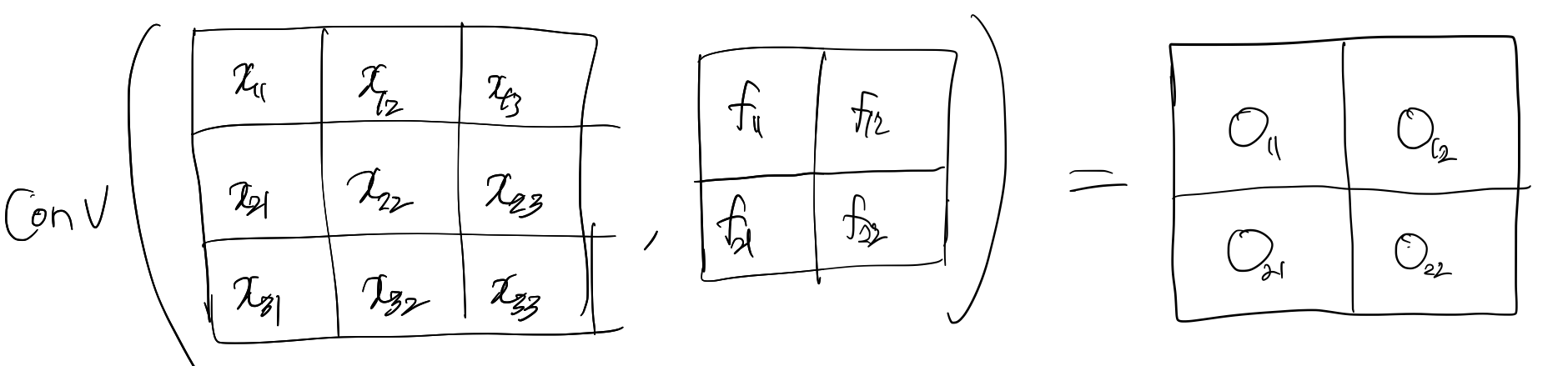3 x 3 데이터에 2 x 2 kernel을 적용하여 2 x 2 차원의 출력값을 생성하는 과정에 대해 생각해보자. $O_{11}, \cdots, O_{22}$는 아래와 같이 정의된다.