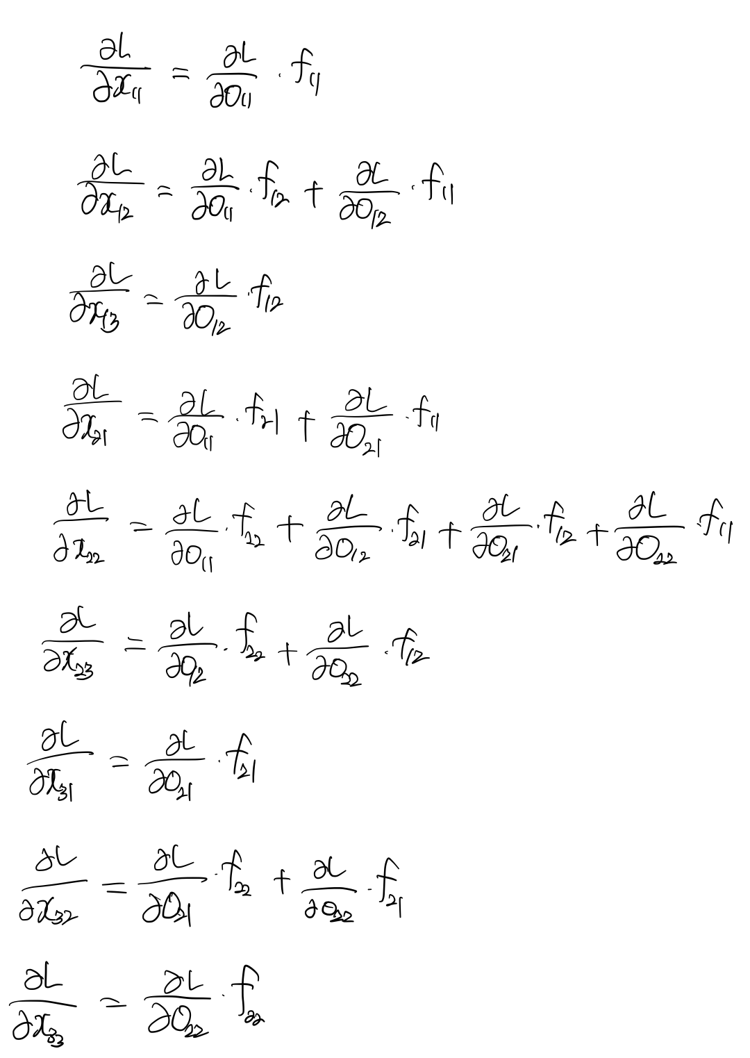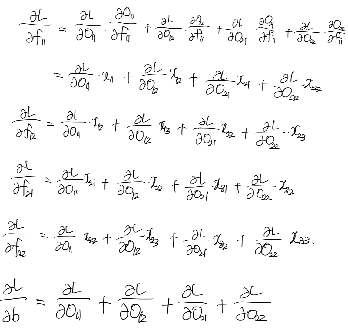 여기서 모델 가중치는 $f_{11}, \cdots, f_{22}, b$ 이므로 이에 대한 gradients을 구하면 된다. 아래를 살펴보자.