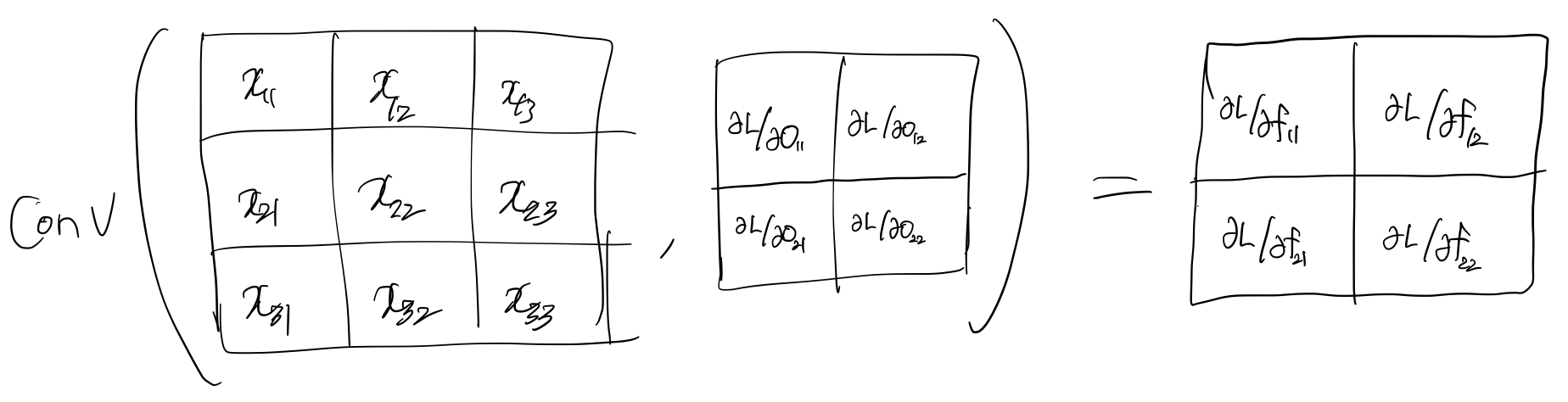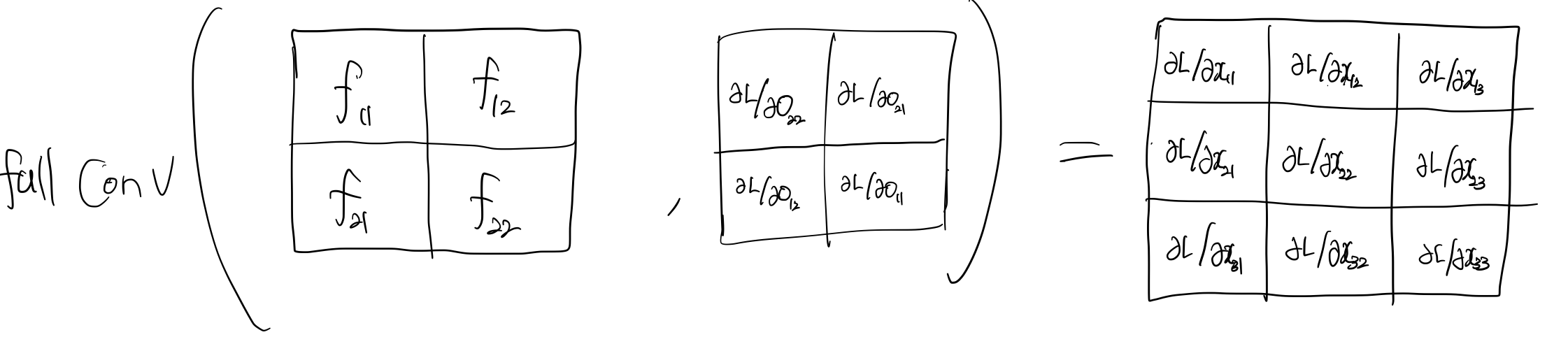 upstream gradient인 $\dfrac{\partial L}{\partial O_{ij}}$와 함께 계산된다. 근데 잘 살펴보면, upstream gradient와 입력 데이터간에 convolution임을 눈치챌 수 있다.