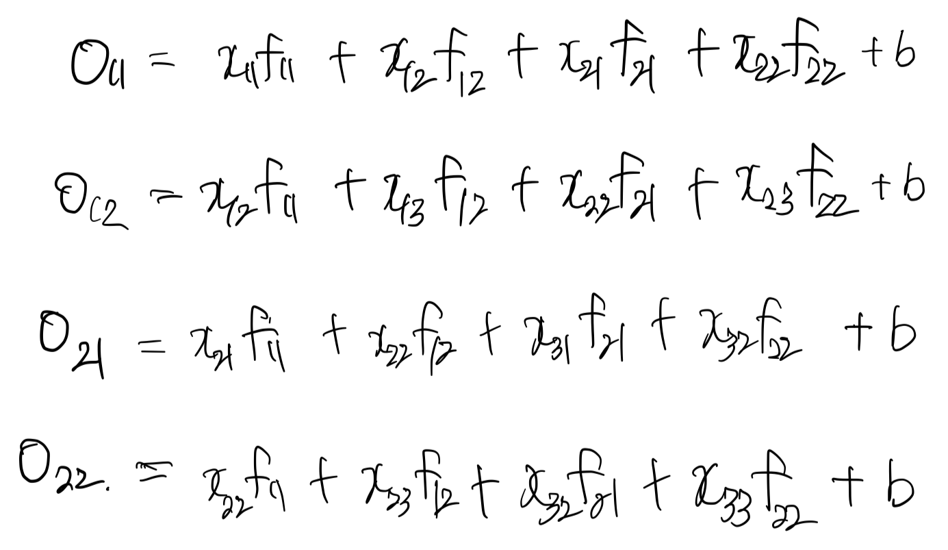 위 수식은 forward 결과 값이다. 학습해야하는 모델 가중치는 $f_{11}, \cdots, f_{22}, b$ 임을 확인할 수 있다. 먼저 convolution 레이어의 기초가 되는 convolve 함수를 구현해보자. (코드는 여기서 확인할 수 있다.)
