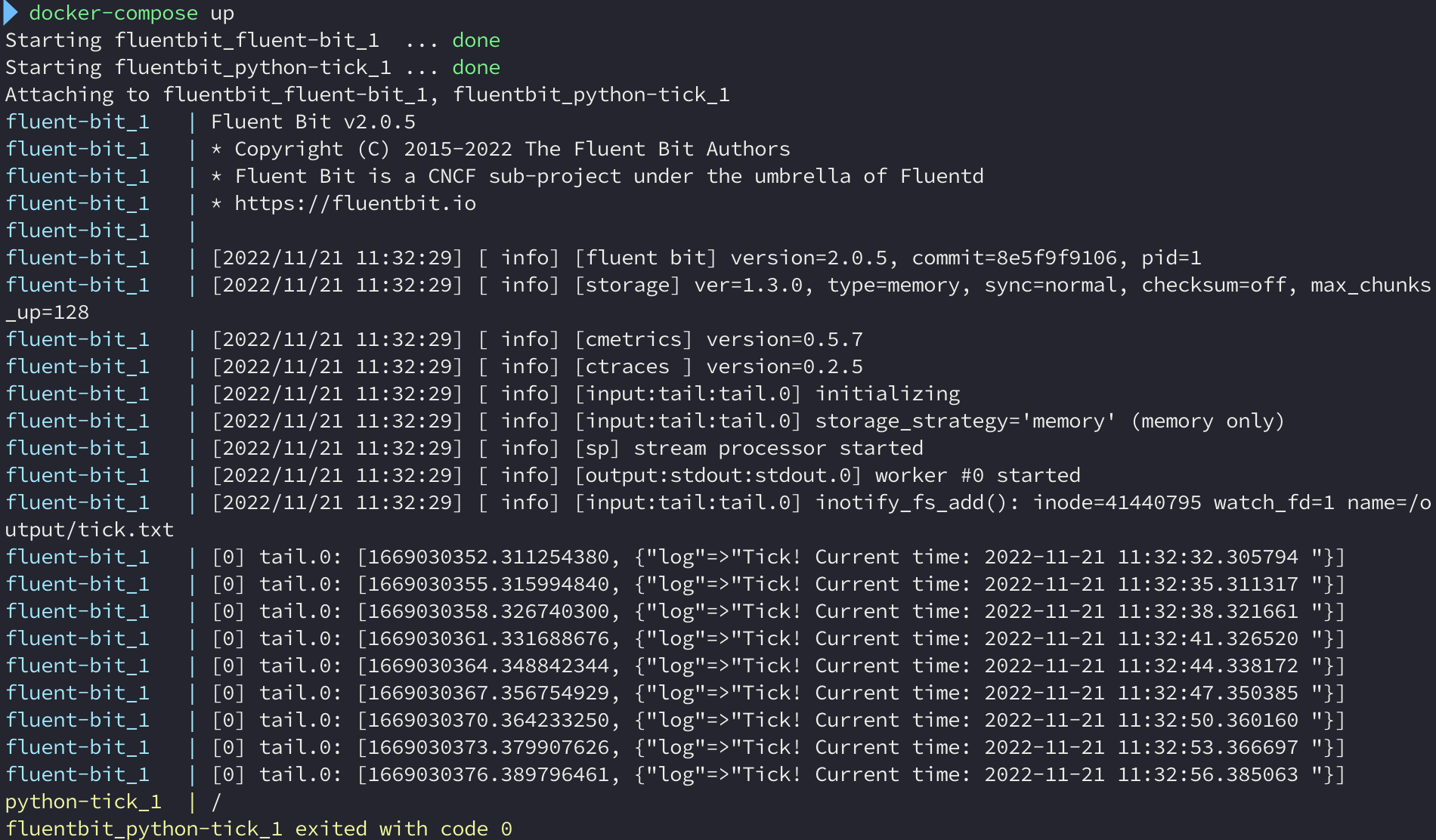 3초에 한번씩 메세지를 뱉는 python-tick 컨테이너와 fluent bit 컨테이너를 띄운다. python-tick에서 발생하는 로그는 호스트의 ./output 디렉토리와 연결되고 이는 다시 fluent bit 컨테이너의 /output 디렉토리와 연결된다.